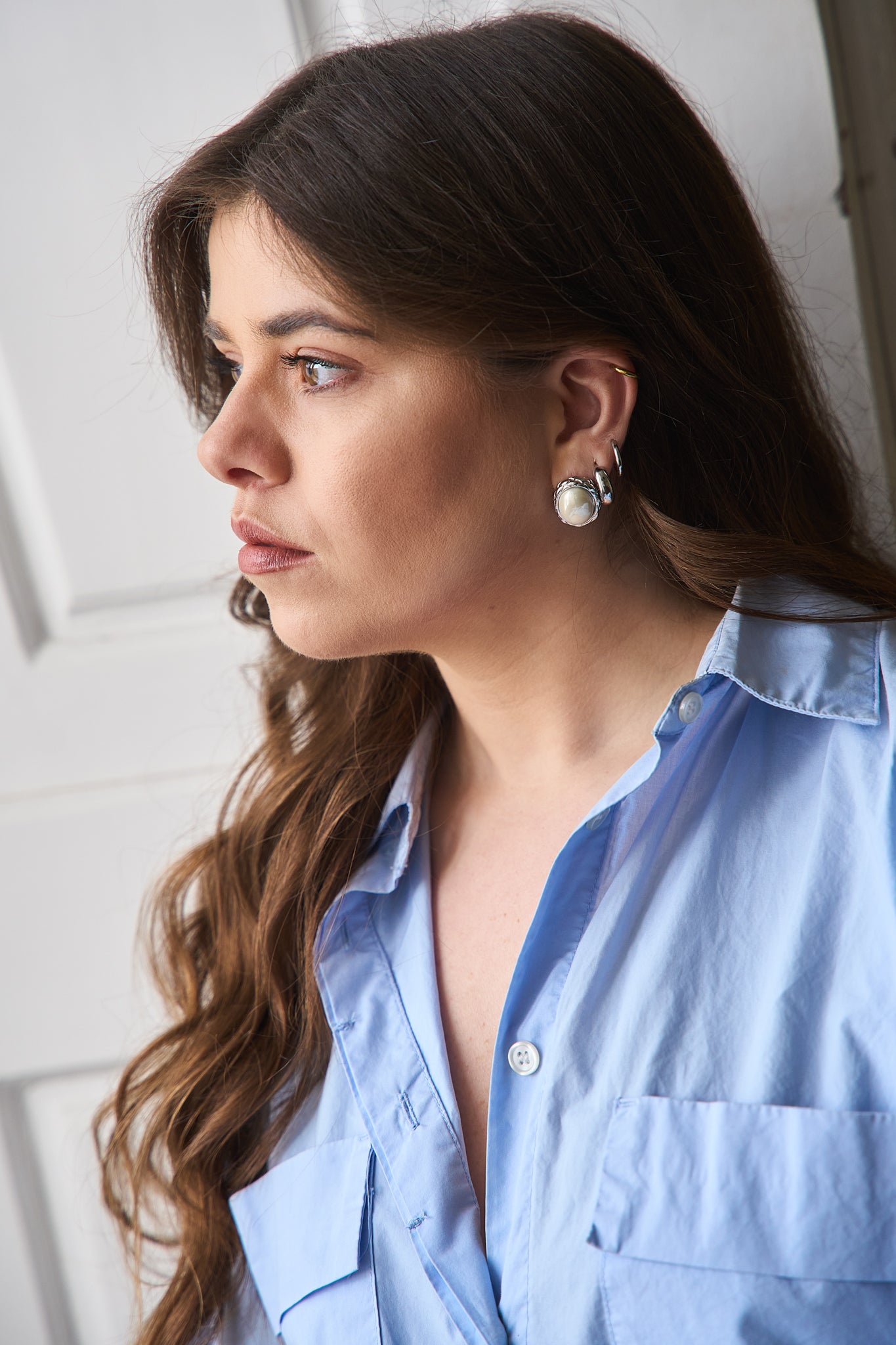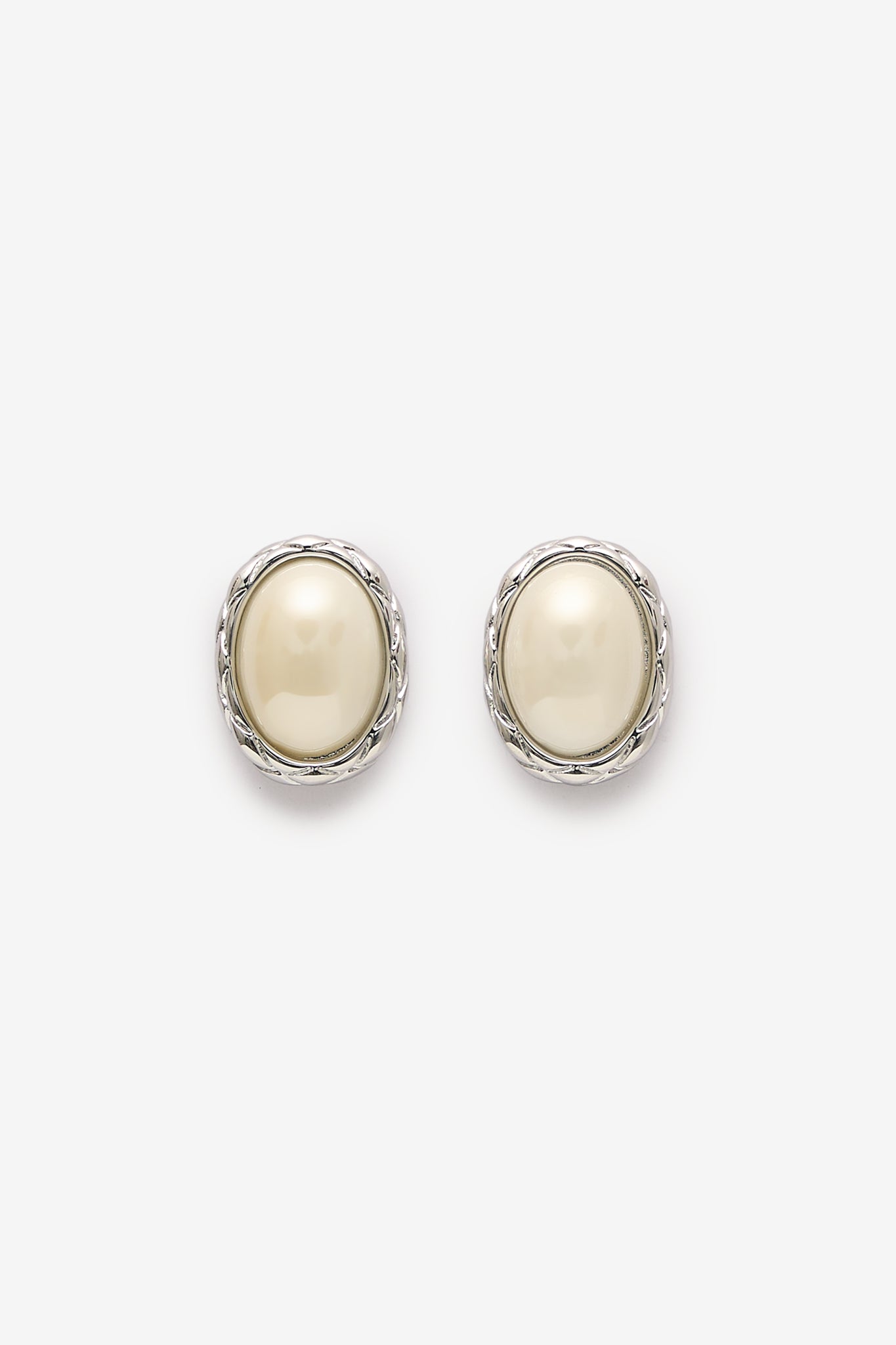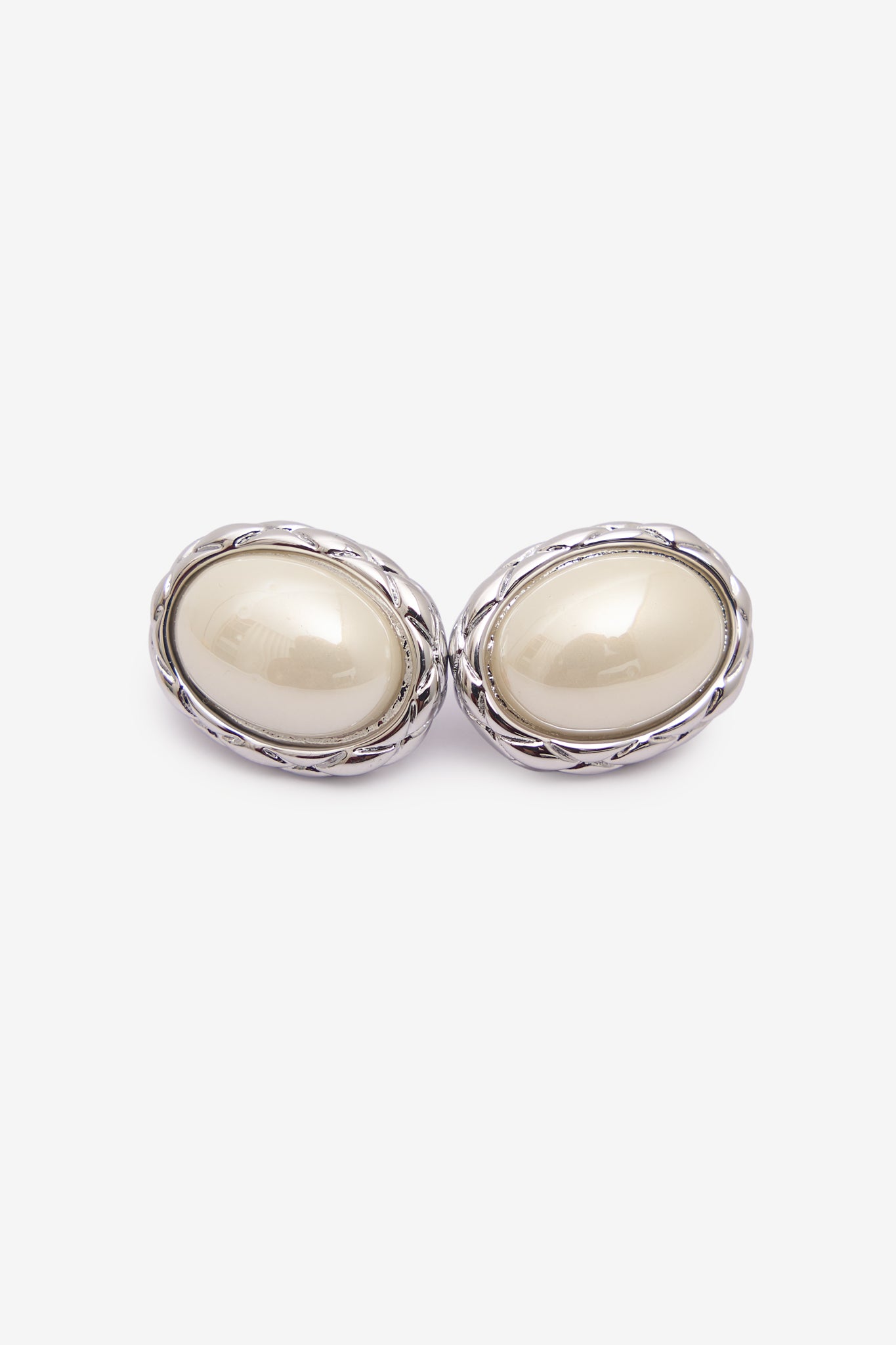 Brincos em aço inoxidável com detalhe central perolado e moldura trabalhada. Inspirados no estilo vintage.