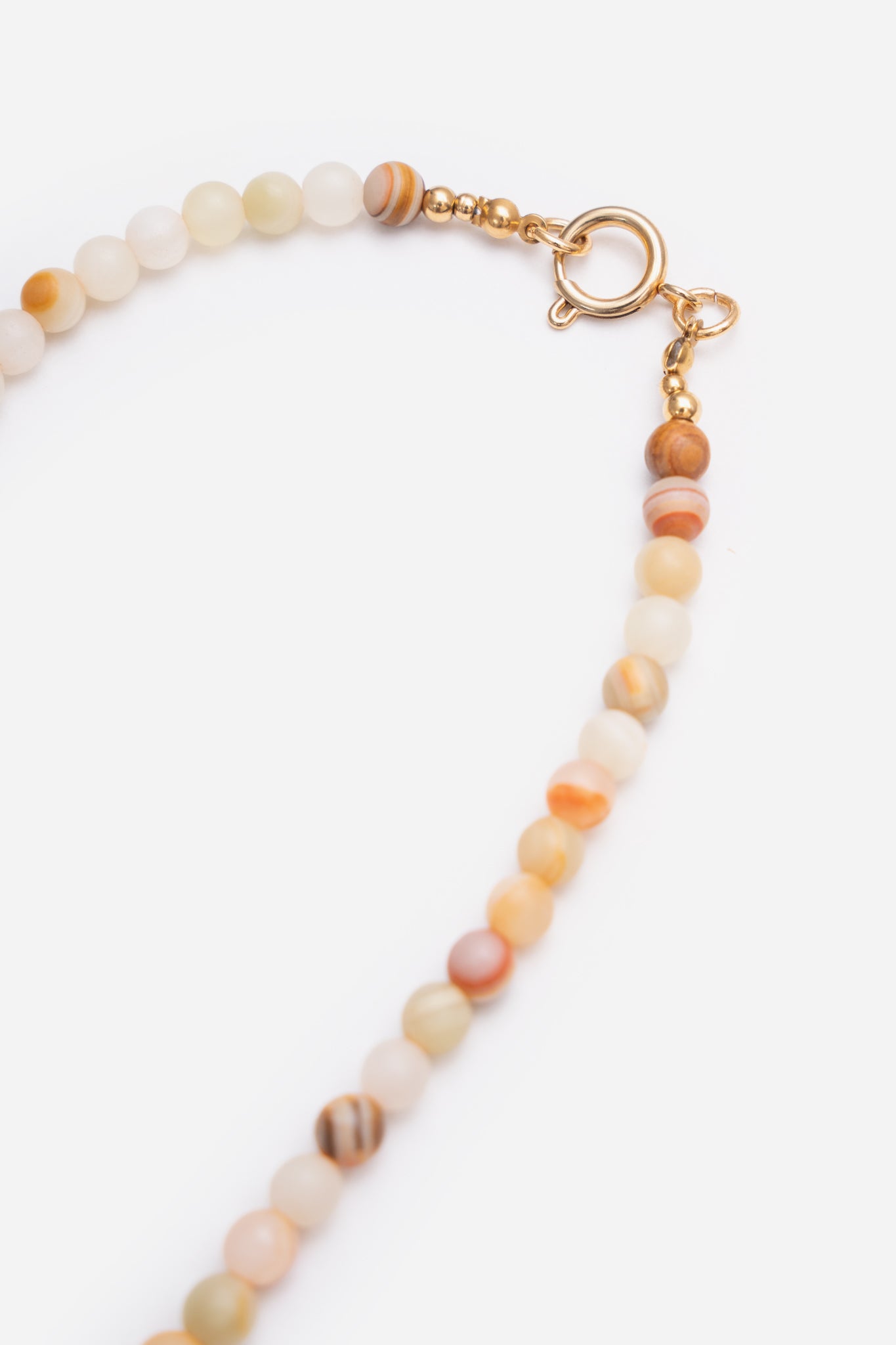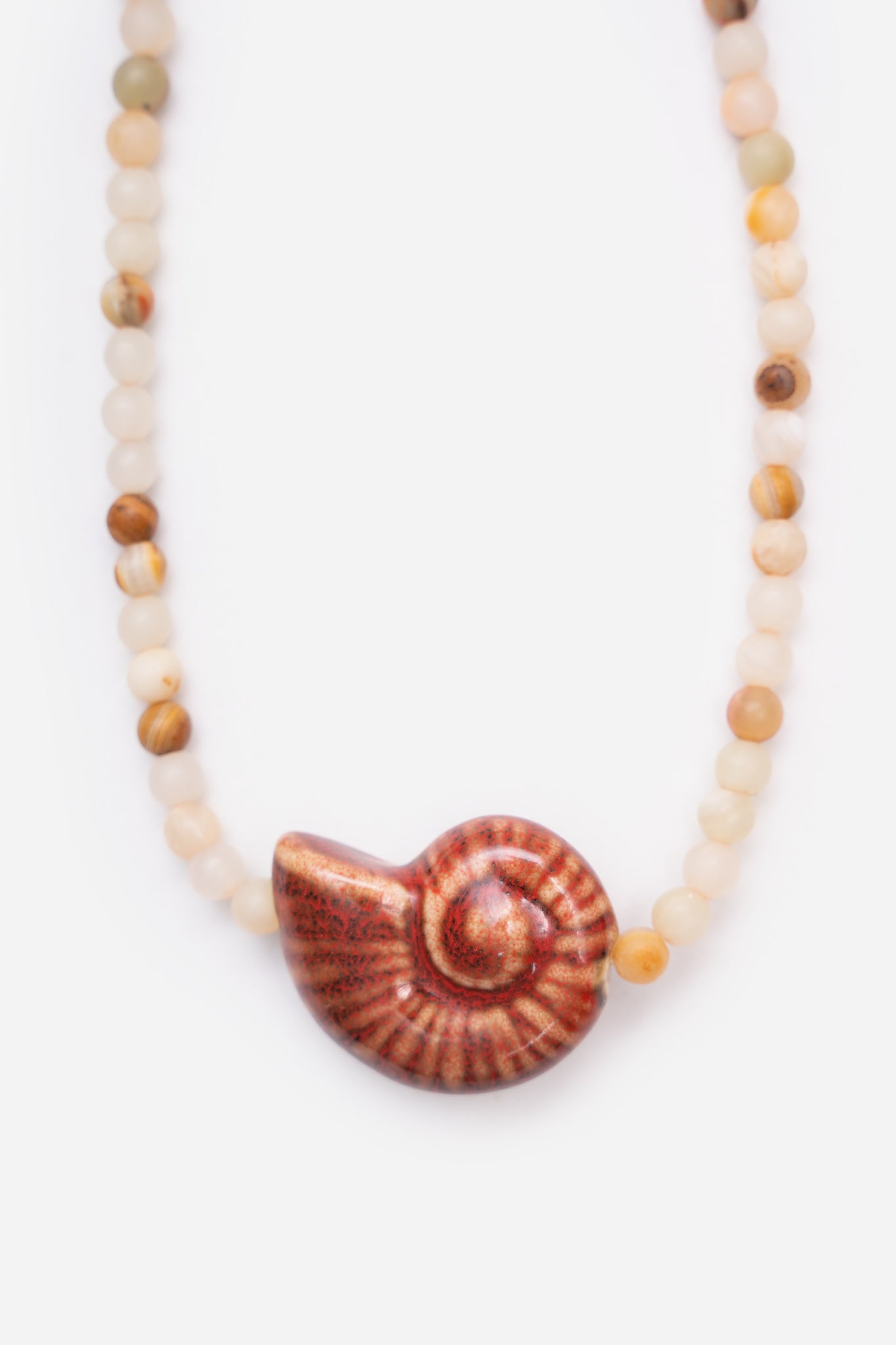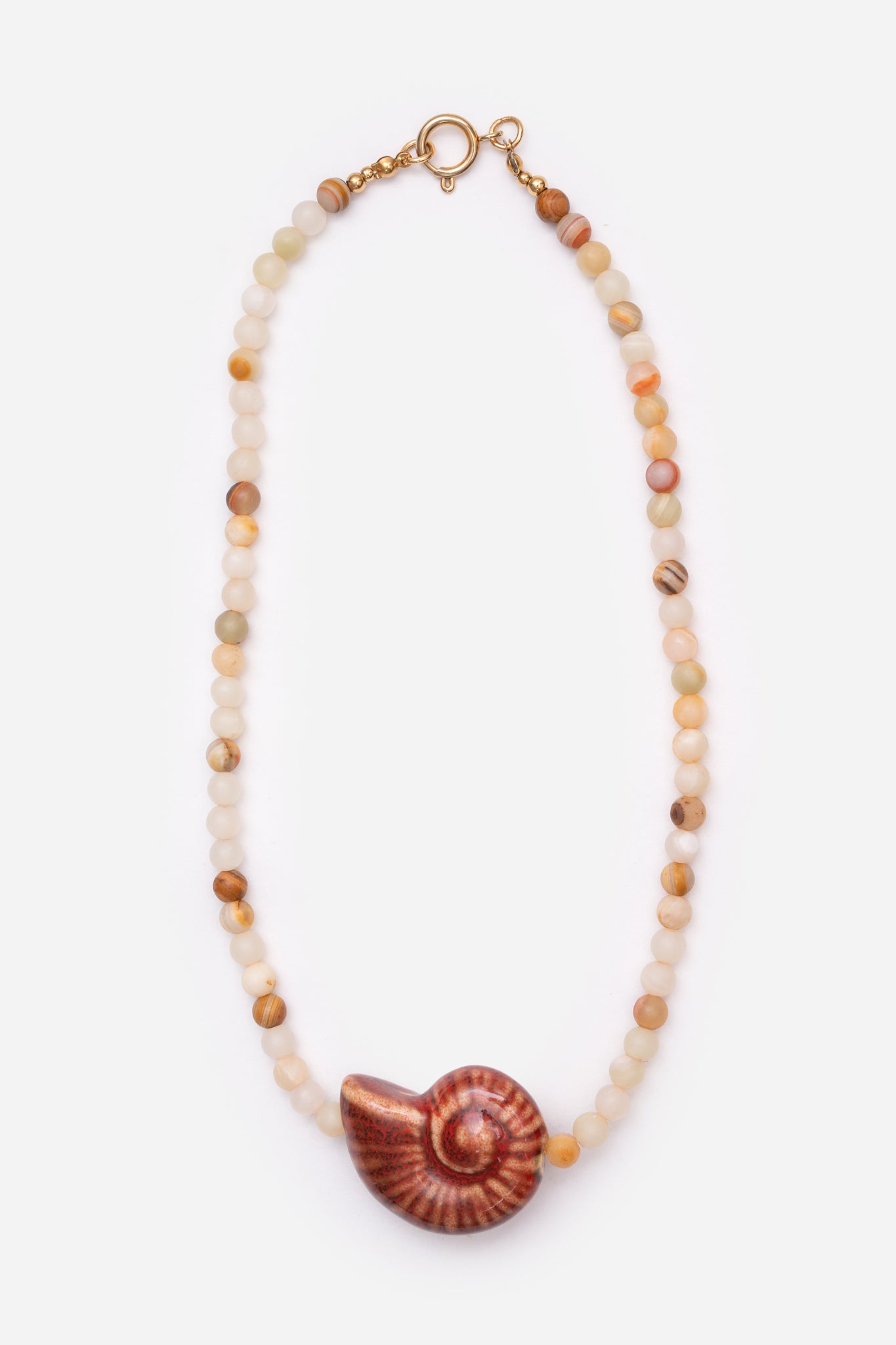 As suas pedras naturais em tons terrosos e neutros evocam a textura da areia e das rochas moldadas pelo tempo, enquanto o pendente em forma de concha traz consigo a memória do oceano e do verão.