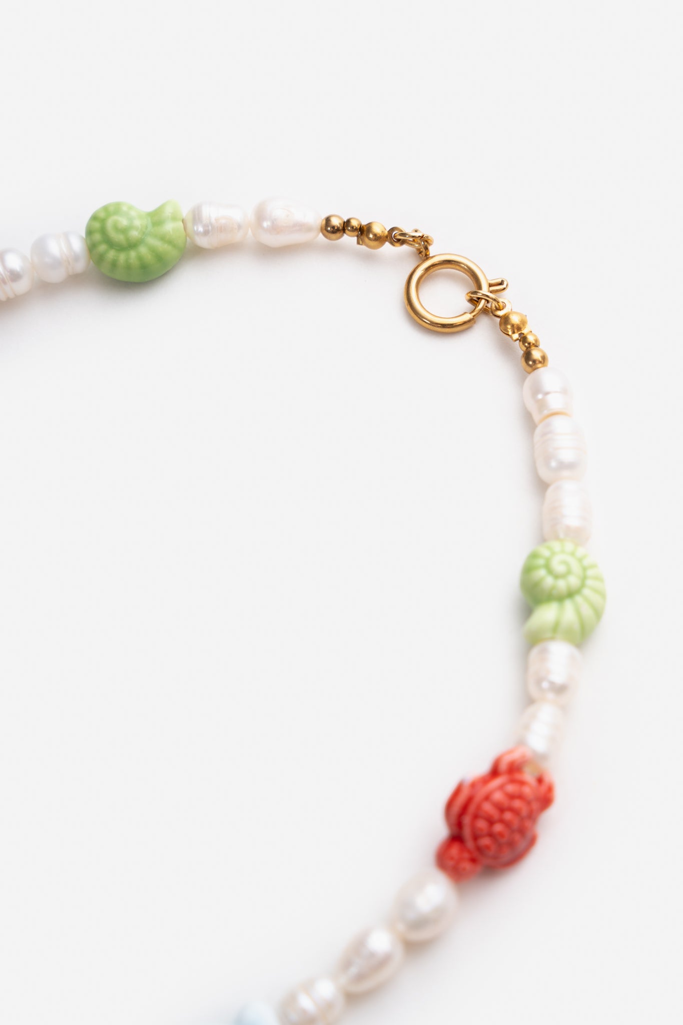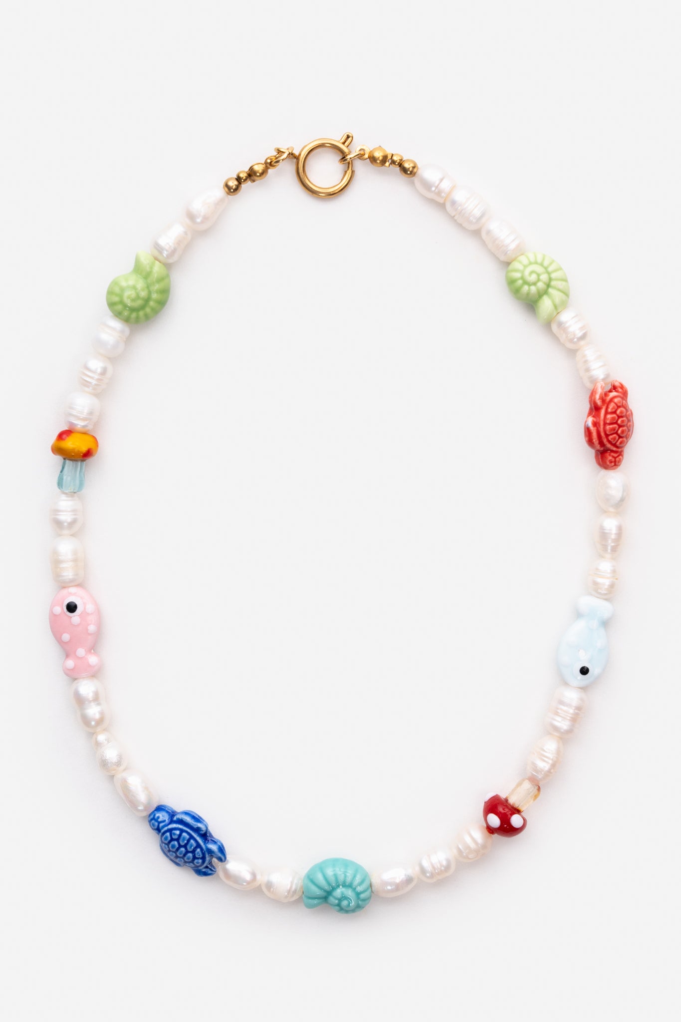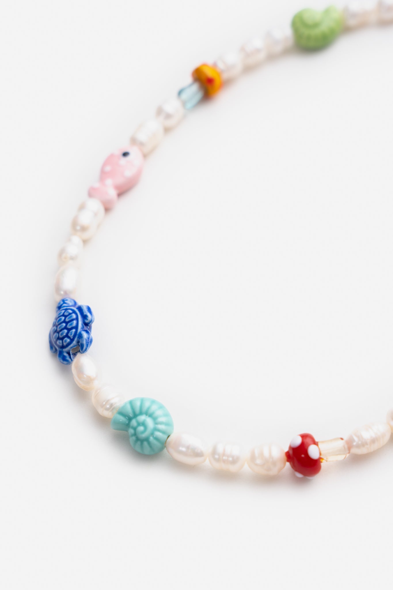 O Colar Fundo do Mar é uma peça encantadora, inspirada nos pequenos tesouros escondidos nas profundezas do oceano. Entre pérolas irregulares, cores suaves e detalhes em vidro, este colar convida-te a mergulhar num universo leve, divertido e cheio de vida.